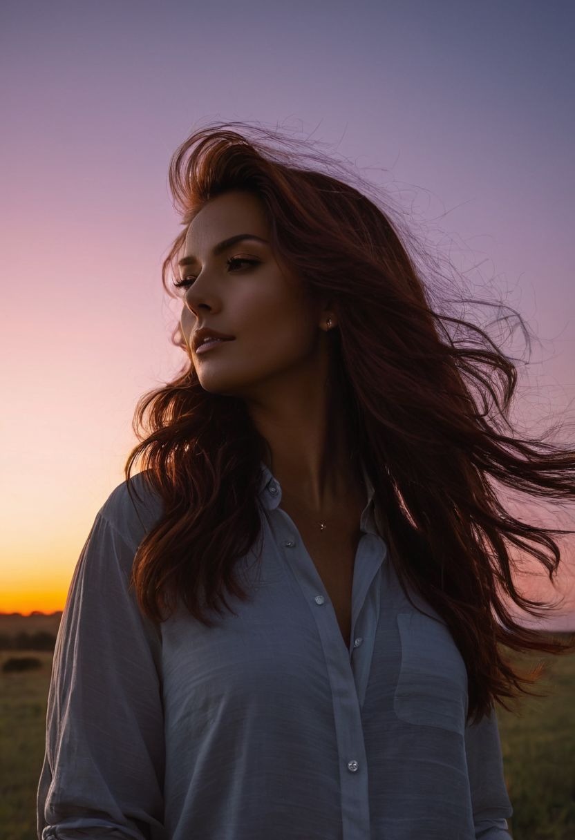 Embrace the enchanting twilight hours, as the soft glow of the setting sun illuminates the woman's face and hair, creating a magical ambiance. The A7R IV's exceptional low-light performance, coupled with its 4K resolution, captures the subtle hues and tones of the twilight sky in stunning detail. The ultra-realistic rendering of her hair, illuminated by the fading light, adds a surreal and otherworldly element to the melancholy atmosphere