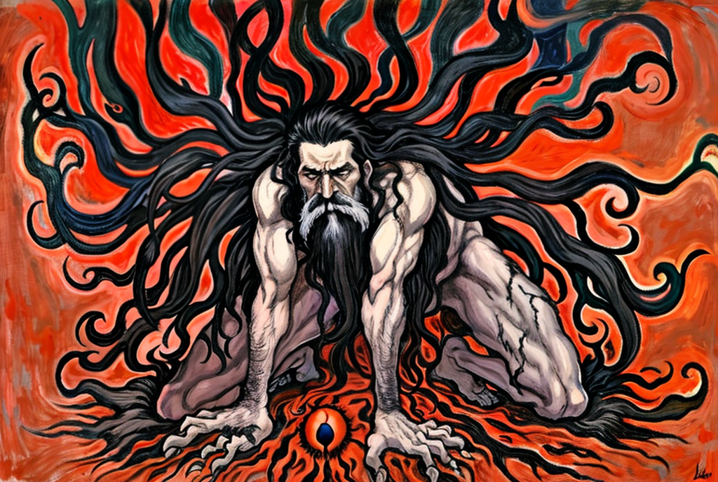 A demoniac landknt with a beard, long hair, mustache, on his knees, witnessing the death of the universe, Tornado, Neoclassical, (Jake and Dinos Chapman:1.25), Poppies, Disquieting, Afterimage and optical illusion colors, Symmetry, Tempera, Spotlight, Parchment, Cylinder, ultra detailed, intricate, oil on canvas, <lora:landknt:0.5>