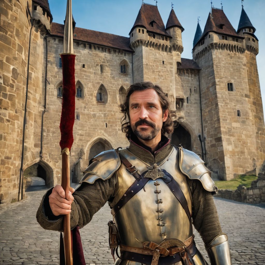 score_9, score_8_up, score_7_up, 1man, man 30 years old, (holds a pike in his hand), middle age, (pikeman), middle age, mustache, wrinkles on his face, serious, soldier uniform with predominance of blue color, in front of the doors of a medieval castle, torches