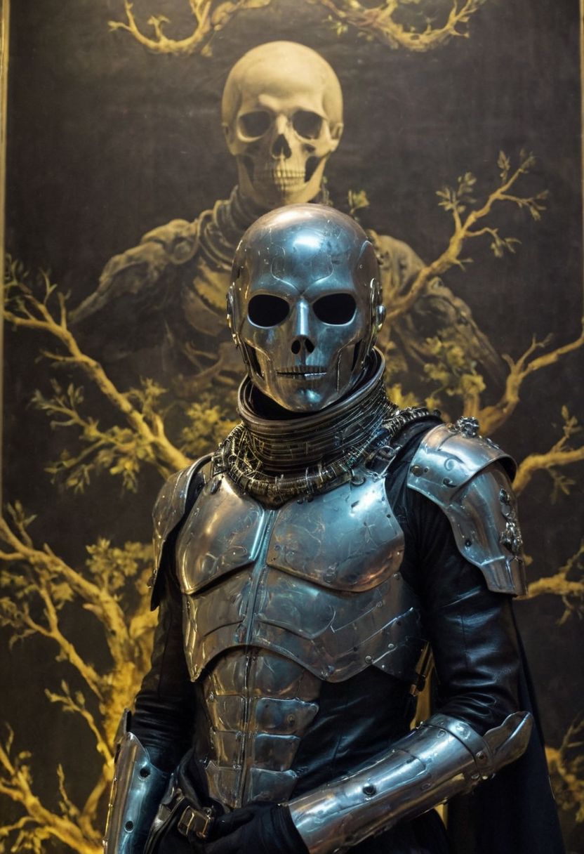 amazing quality, masterpiece, best quality, hyper detailed, ultra detailed, UHD, perfect anatomy, portrait, dof, hyper-realism, majestic, awesome, inspiring, (best quality ) , detailed, Soviet cosmonaut portrait digital art: A bold Cyborg knight detailed Iron armor bound By wires, Strings and luminous hoses, resembling Jojo jonathan joster, his metallic face, neck, and exposed skin areas adorned with weathered sss blue-turqoise tones, a testament to time, battle and sunlight. With arms raised in greeting, she embodies a blend of retro charm and cybernetic allure.. cinematic composition, soft shadows, national geographic style, bw-grignani, emphasis lines, horizontal perfect bold lines, perfect align lines, Capture the enigma: a Knight resembling Jonathan joster leaning regally at a lavish tree on a cliff at the sea, his arms casually draped over its branches. Adorned in a iron plaster skull Mask and a black high collar scarf, paired with fur and leather gloves, he exudes a captivating contrast. Her ensemble is completed with a translucent DARK luminous Neon magenta-yellow Skull in his Hand and a Large voluminous trailing black tulle train. Amidst the opulent surroundings of a kentaro Miura inspired room infront of a huge painting of a simplified cute cat, he embodies a fusion of mystery and elegance.. with endless lines guiding the eye.