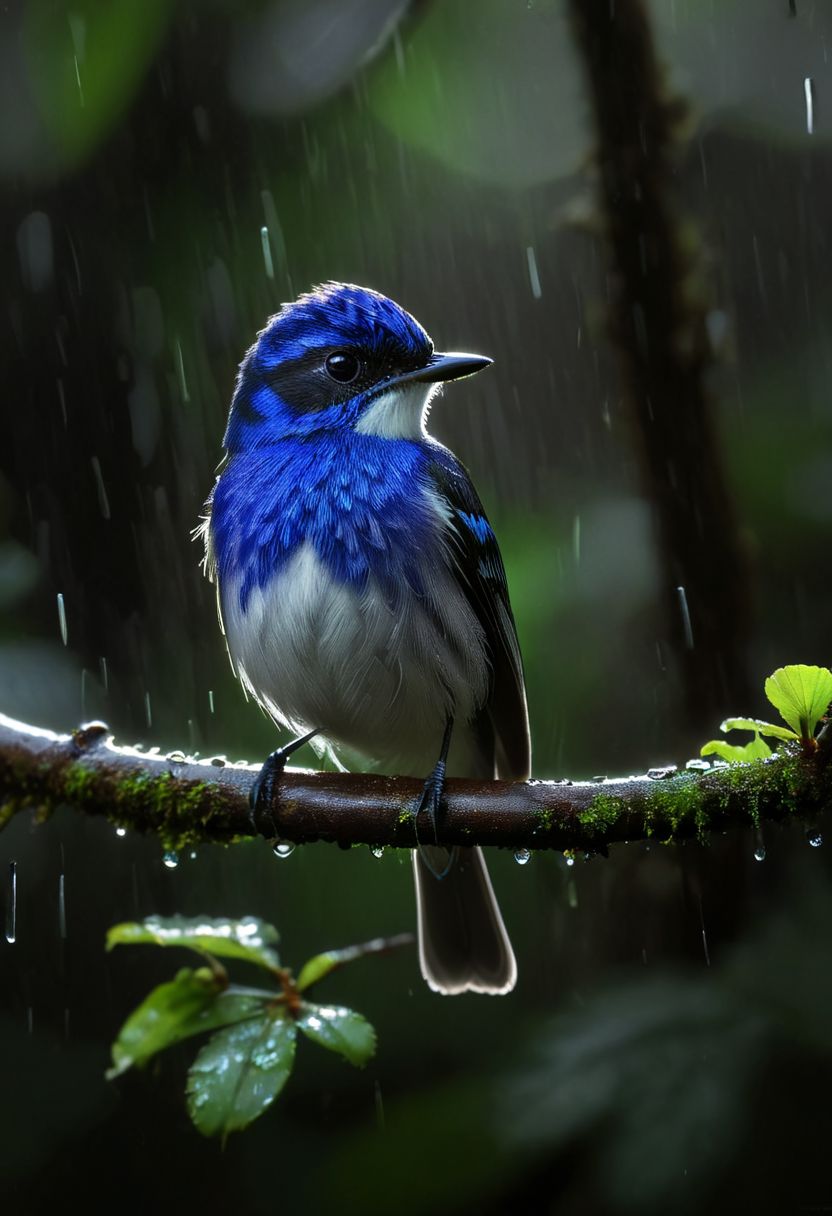 ( a ultramarine flycatcher on a branch , glowing iridescent feather ) , perfect composition , perfect eyes , shadows, glow, realistic, god ray , rain forest , peaceful , <lora:- SDXL - vanta-black_contrast_V3.0:0.8>, detailed many details, clear focus , extreme detailed, full of details, Wide range of colors., Dramatic,Dynamic,Cinematic,Sharp details Insane quality. Insane resolution. Insane details. Masterpiece. 32k resolution. <lora:add-detail-xl:0.95> <lora:dvr-lnds-sdxl:0.3> dvr-lnds-sdxl <lora:MJ52:0.25> <lora:ral-apoctvisn-sdxl:0.3> ral-apoctvisn <lora:zavy-cntrst-sdxl:0.35> dark, chiaroscuro, low-key <lora:zavy-rmlght-sdxl:0.41> zavy-rmlght <lora:SDXLFaeTastic2400:0.225>