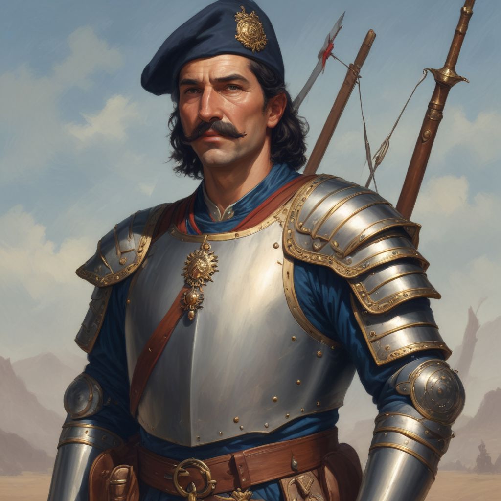 score_9, score_8_up, score_7_up, 1man, man 30 years old, holds a pike in his hand, middle age, pikeman, middle age, mustache, wrinkles on his face, serious, soldier uniform with predominance of blue color