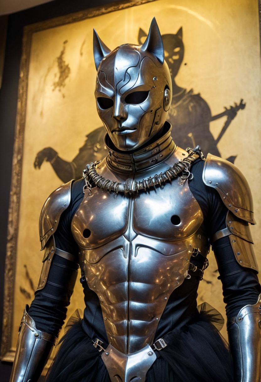 amazing quality, masterpiece, best quality, hyper detailed, ultra detailed, UHD, perfect anatomy, portrait, dof, hyper-realism, majestic, awesome, inspiring, (best quality ) , (The black cat has gone to heaven portrait digital art: A bold Cyborg knight detailed Iron armor bound By wires, Strings and luminous hoses, resembling Jojo jonathan joster, his metallic face, neck, and exposed skin areas adorned with weathered sss blue-turqoise tones,) a testament to time, battle and sunlight. With arms raised in greeting, she embodies a blend of retro charm and cybernetic allure.. cinematic composition, soft shadows, national geographic style, bw-grignani, emphasis lines, horizontal perfect bold lines, perfect align lines, Capture the enigma: a Knight resembling Jonathan joster leaning regally at a lavish tree on a cliff at the sea, his arms casually draped over its branches. Adorned in a iron plaster skull Mask and a black high collar scarf, paired with fur and leather gloves, he exudes a captivating contrast. Her ensemble is completed with a translucent DARK luminous Neon magenta-yellow Skull in his Hand and a Large voluminous trailing black tulle train. Amidst the opulent surroundings of a kentaro Miura inspired room infront of a huge painting of a simplified cute cat, he embodies a fusion of mystery and elegance.. with endless lines guiding the eye.