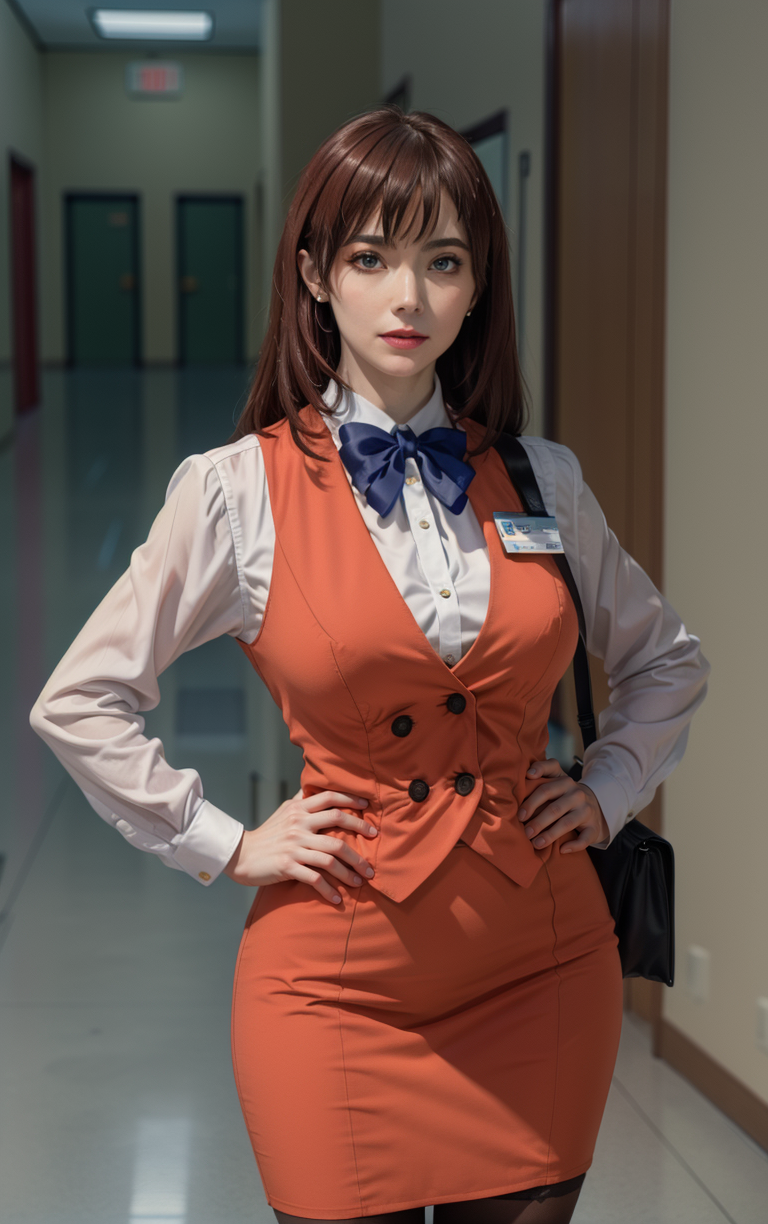 ((masterpiece, best quality)), insaneres, absurdres, solo, looking at viewer, BREAK OrangeSuit_Lingeries_RenaAsaoka_ownwaifu, 1girl, brown hair, red eyes, long hair, lipstick, earrings, makeup, lips, bangs, hair between eyes, large breasts, shiny hair, orange vest, name tag, vest, blue bow, long sleeves, pencil skirt, bowtie, see-through legwear, formal, white shirt, office lady, (contrapposto, hand on hip), sunset, sidelighting, outdoors, <lora:FAP_CHR_Lingeries_RenaAsaoka_ownwaifu:1> , depth of field ,