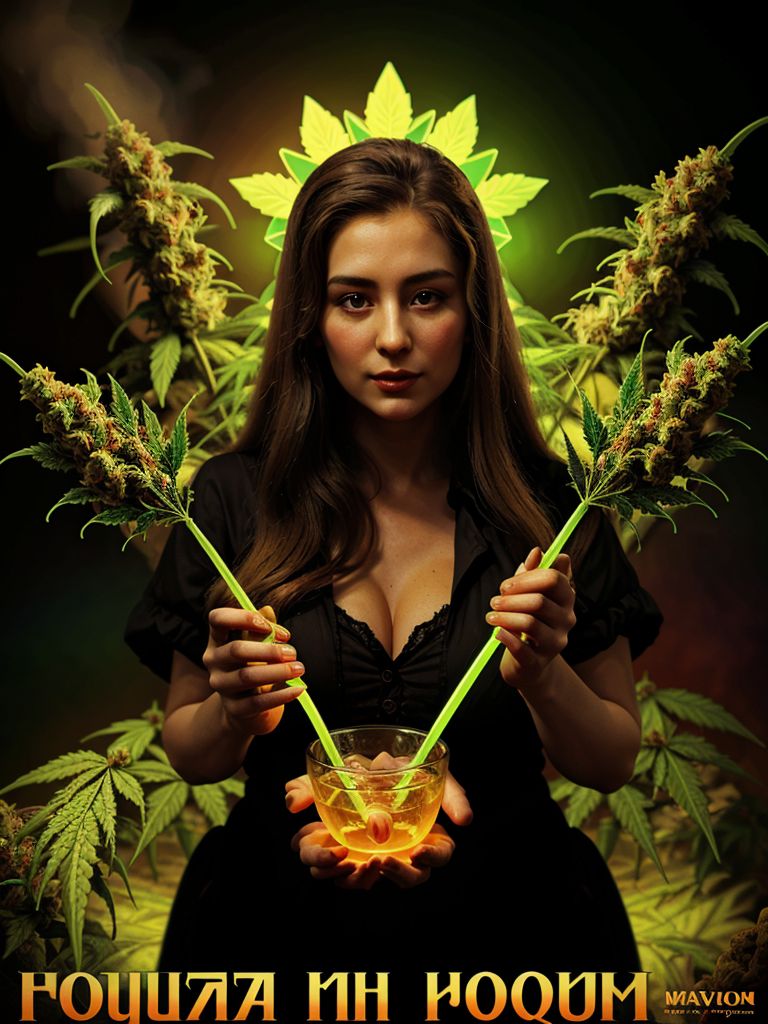 vintage soviet propaganda poster, Vodka, cannabis, marijuana, releasing neon glowing spores, digital art, woman DarkFantasy