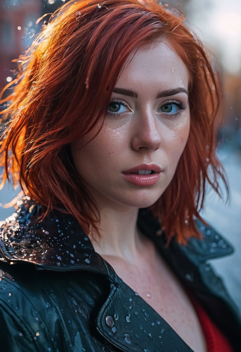 (best quality, high quality, sharp focus:1.4), (post-coital:2), beautiful european woman who has just had passionate and energetic sex, (natural red hair: 1.1), open coat, frontal view, leather boots, Irish, freezing rain, striking makeup, onoff, goosebumps, freezing cold, empty street, film, bokeh, professional, 4k, highly detailed, fujifilm XT3, dark, analog photo, deep shadows, by ilya kuvshinov