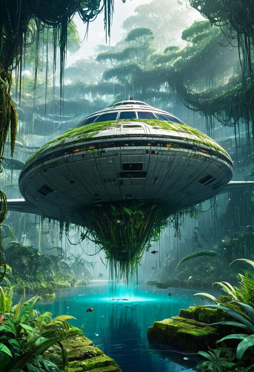 CoverArt, a huge spaceship (long abandoned) on the jungle floor half sunken in the ground, half submerged in water, covered in plants, trees, sharp, high detailed, realistic, day, colorful, god lights