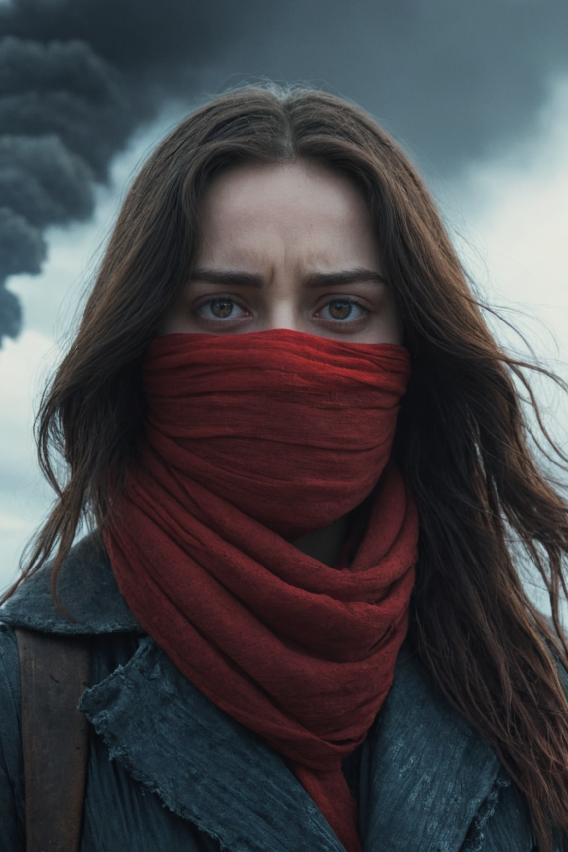 Woman, red scarf on face, character portrait, (mortal engines:1.2), epic photo