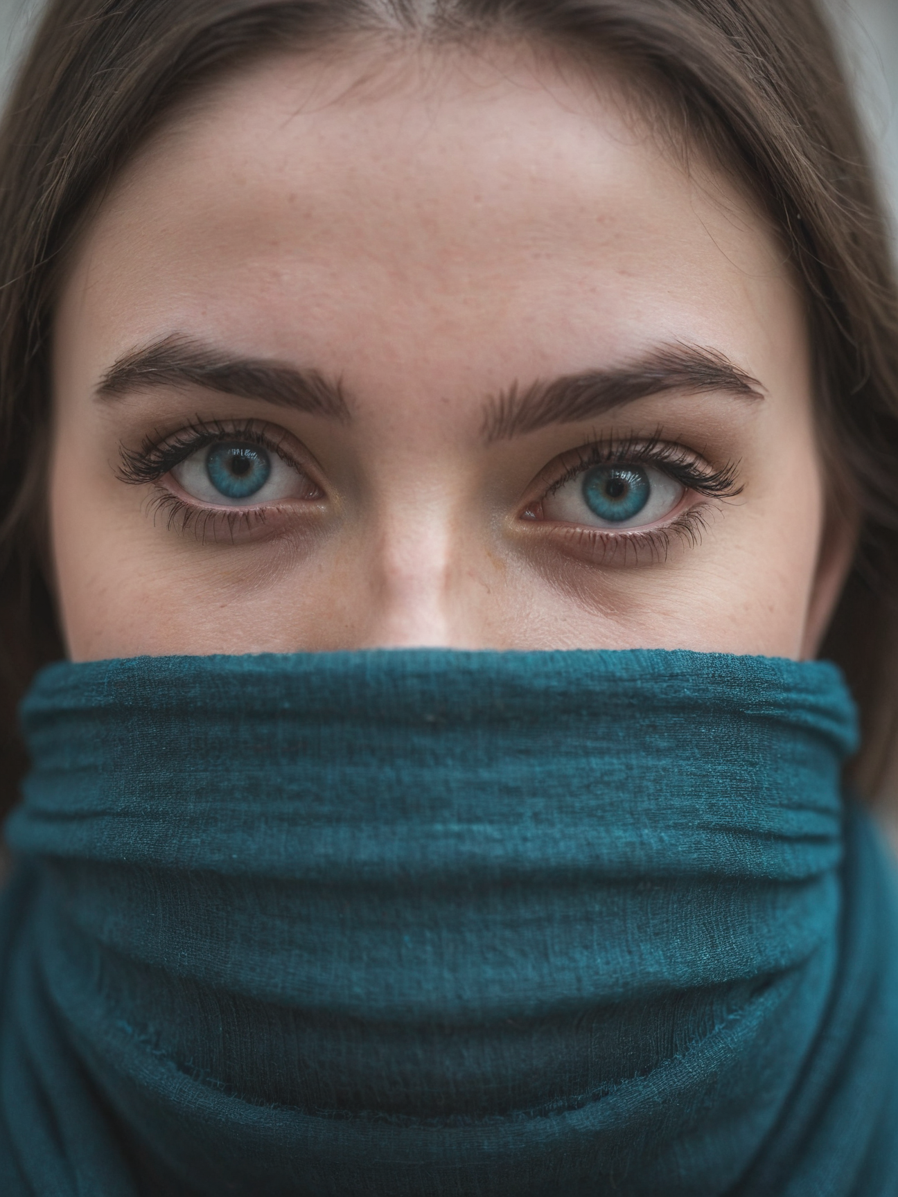 Close-up of a young woman's face partially obscured by a dark teal scarf, highlighting her striking blue eyes, long eyelashes, and well-defined eyebrows. The focus is sharp on her eyes with a soft bokeh background that creates a shallow depth of field. Her brunette hair frames her face, and the image has a cool color tone with a natural light setting. The composition is centered, creating an intimate and engaging portrait with a sense of mystery.