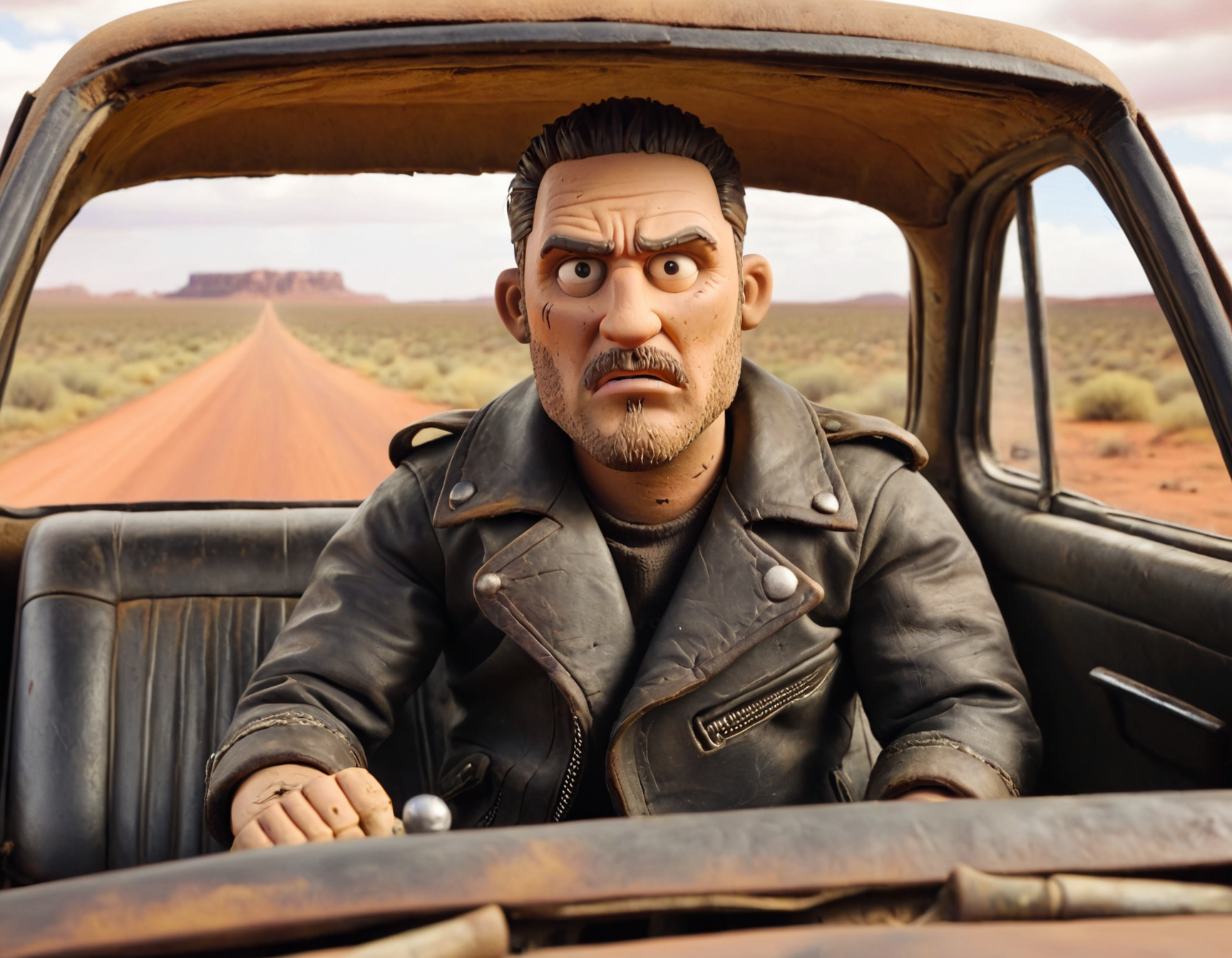 <lora:Aardman Animations Style:0.55> aardman, animations, style <lora:CLAYMATE_V2.03_:0.45> claymation dramatic scene from movie "mad max" car interior, old muscle car, a grizzled man (tom hardy) with stubble , short hair, determined expression, wearing old leather jacket, driving his car through the outback <lora:Cinematic Film Stock Footage Style:0.5> cinematic, film, stock, footage