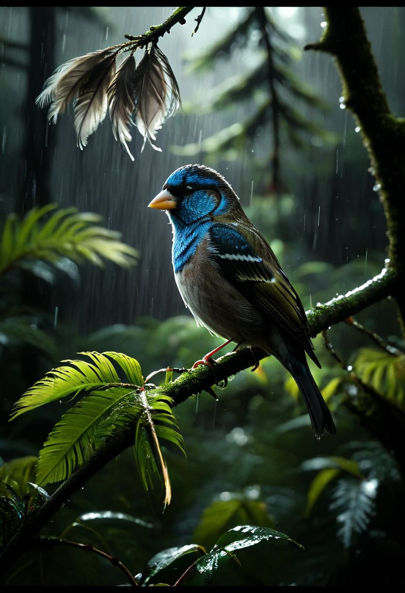 ( a finch on a branch , glowing iridescent feather ) , perfect composition , perfect eyes , shadows, glow, realistic, god ray , mountain background , rain forest , peaceful , <lora:- SDXL - vanta-black_contrast_V3.0:0.8>, detailed many details, clear focus , extreme detailed, full of details, aesthetic and beauty, astounding details, high depth of field, f/4, framing, breakthrough, collodion process, soft particles, ageless atmosphere, (grey and green colors:0.1),dark, chiaroscuro, low-key, <lora:TWbabeXL01:0.4> Wide range of colors., Dramatic,Dynamic,Cinematic,Sharp details Insane quality. Insane resolution. Insane details. Masterpiece. 32k resolution. <lora:add-detail-xl:0.95> <lora:dvr-lnds-sdxl:0.3> dvr-lnds-sdxl <lora:MJ52:0.25> <lora:ral-apoctvisn-sdxl:0.3> ral-apoctvisn <lora:zavy-cntrst-sdxl:0.35> dark, chiaroscuro, low-key <lora:zavy-rmlght-sdxl:0.41> zavy-rmlght <lora:SDXLFaeTastic2400:0.225>