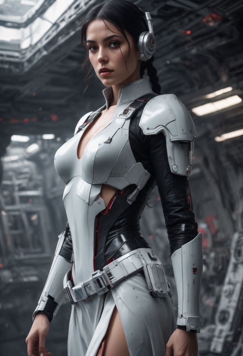 Beautiful Jedi Knight girl, Intricately Designed Jedi Knight tight White-Red Dress, Star Wars style, Standing aboard a Republic spaceship, realistic brown eyes, wavy black hair, Sensual female curves, perfect athletic figure, beautiful perfect detailed pupils, wet oily shiny skin, beautiful firm Breasts, defiant and seductive, high contrast, colorful polychromatic, ultra detailed, ultra quality, CGSociety fighting stance, Cinematic Lighting, intricate, smooth, sharp focus digital painting, Asymmetrical Balance, hyperdetailed painting, dynamic lighting, complex, head and full body portrait, 8k resolution concept art portrait by Greg Rutkowski, Attractive, Atrractive 21 years old woman, Attractive bust girl