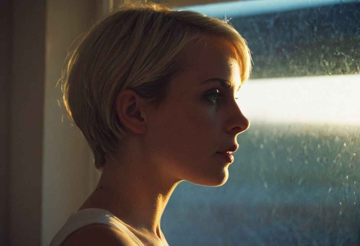 raw photo of 1 girl, 30 years old, slim girl, ((very short blonde hair)),(beautiful face,exquisite face,skin texture:1.2), white shirt, upper body portrait, (ultra-wide angle:1.3), profile against a windows, watching up, pale skin, (masterpiece,best quality,ultra high res:1.2),(photo-realistic:1.3), silhoutte lighting against bright window, rim lighting , dimly lit, kodak tri-x 400, dusk, grainy