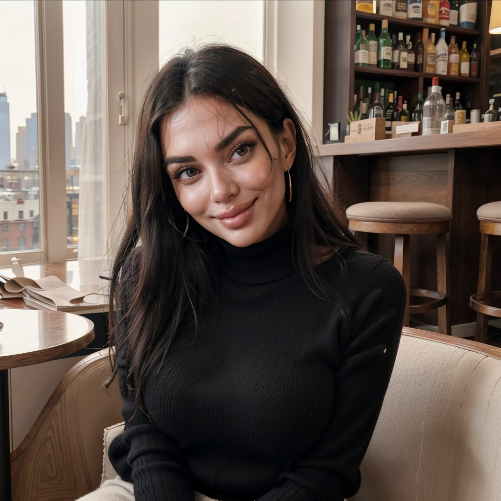 j_gr1 leaning against a bar in new york, wearing a high necked black woollen sweater and pants, smiling, [headshot], [centre frame], looking at the camera, facing the camera