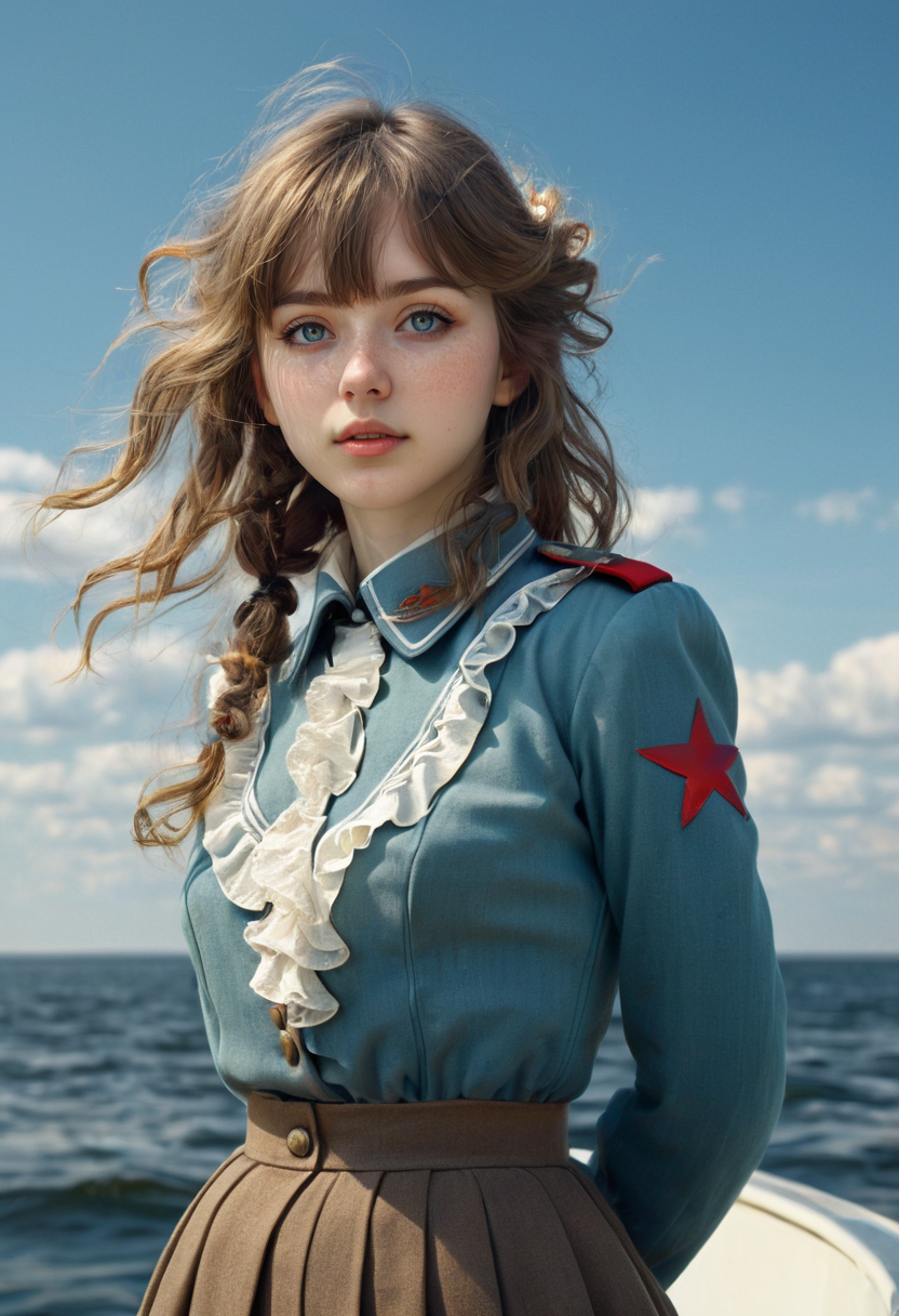 ((ultra-detailed)), ((illustration)), ((disheveled hair)), ((frills)), (1girl), (solo), dynamic angle, beautiful detailed sky, on beautiful detailed water, beautiful detailed eyes, overexposure, side blunt bangs, hairs between eyes, detailed clothes, light, lucia, sharpening, soviet uniform, rough waves, clear face, style of Mattias Adolfsson, masterpiece, best quality, high quality, highres, <lora:WildcardX-XL-Detail-Enhancer:0.4>