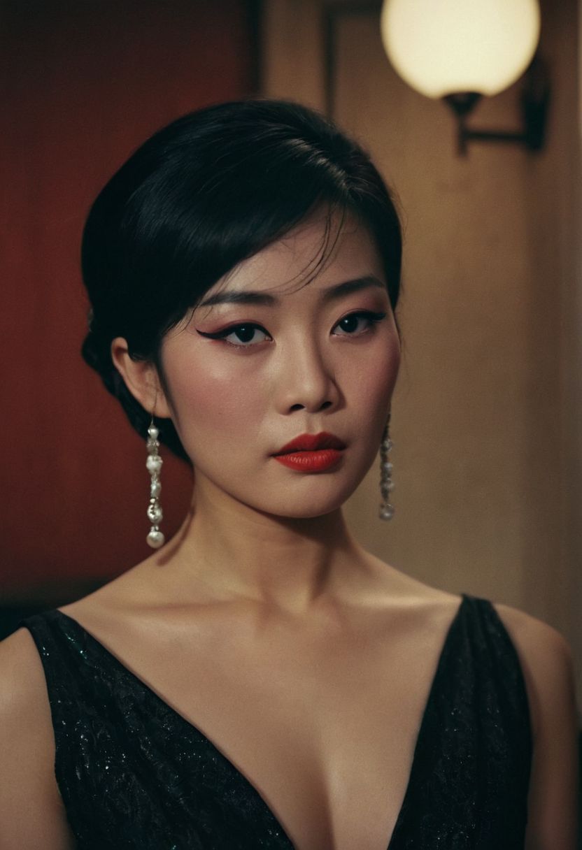 cinematic scene with a black haired asian Woman, heavy makeup, from the movie"in the mood for love", elegant, dark mood, Fujifilm XT3, Canon R5, Fujicolor Fujichrome Velvia 100