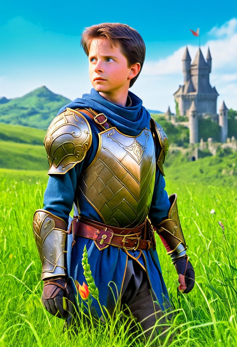 CoverArt, a beautiful gorgeous Young Michael J. Fox as an RPG character, medieval armor, background a green grassland, covered in plants, flowers, colorful, sharp focus, high detailed, realistic, day, blue sky, RPG Cover Art