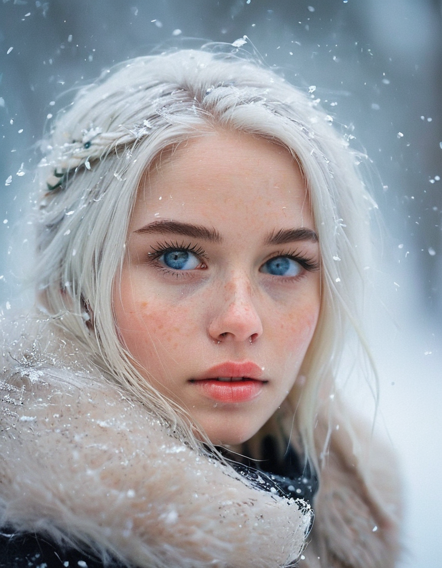 epiCPhoto, photo of a white haired beautiful girl, snow fall, bokeh effect, crystal clear blue eyes