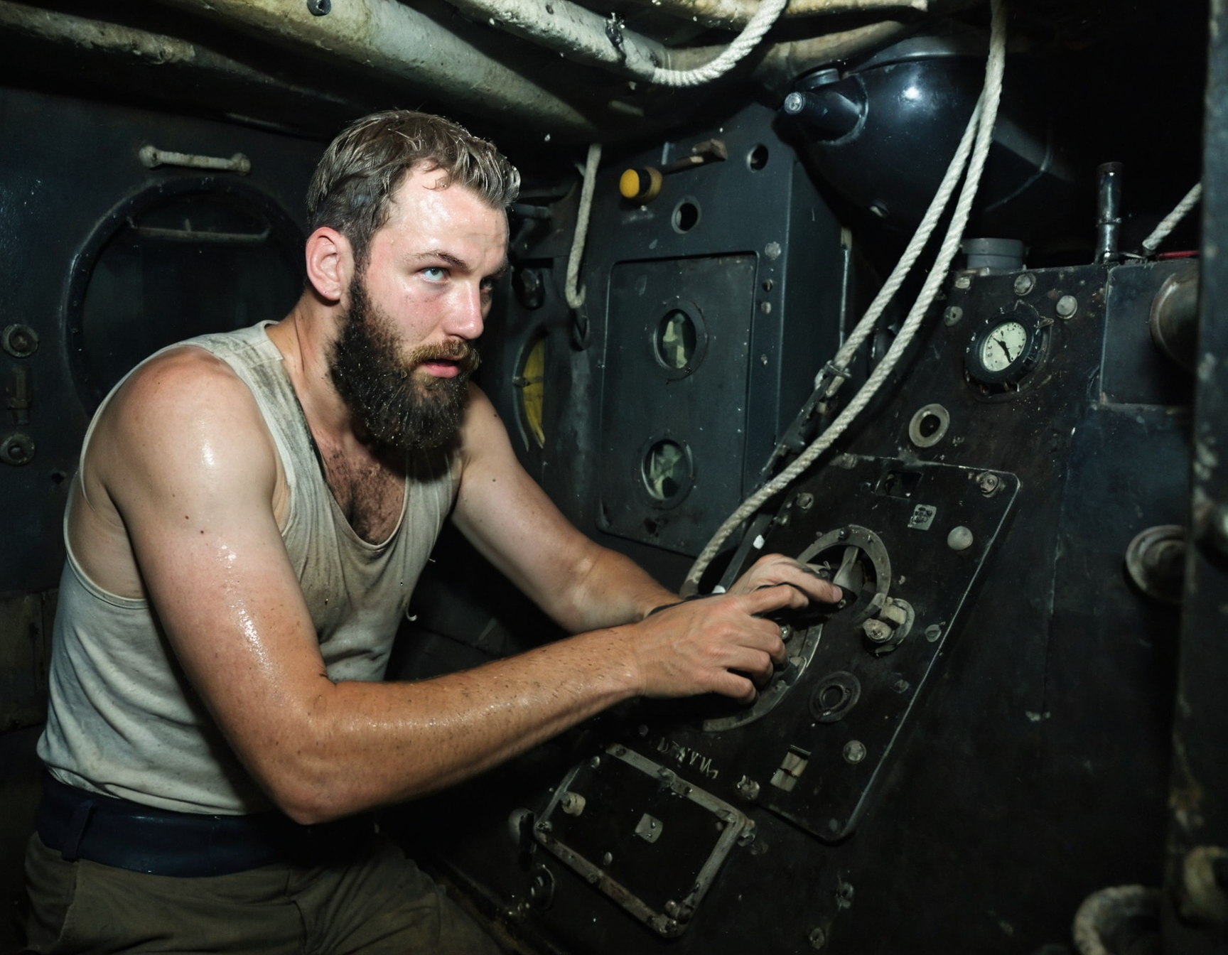 <lora:OldTechnologyXL_1.2:0.75> photo of a sweaty sailor, off centre framing, in dirty tank top, thick beard, pale skin, with sweat and dirt on his body, operates the levers and dials in a cramped submarine, dimly lit, dark shadows, cinematic action shot <lora:1940s style:0.65> 1940's style <lora:Check_Military:0.5> macro, detailed, realism, style, photograph,