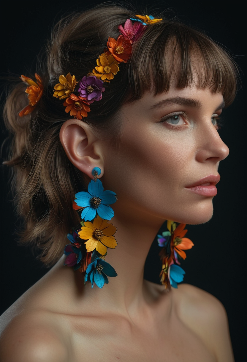 A fashion style pretty woman portrait wearing luxurious detailed colorful flower earrings made from leather scraps in the style of liam sharp, dutch tradition, webcam, gail simone, mark seliger, Alfons Mucha inspired 8k, high resolution, dark background