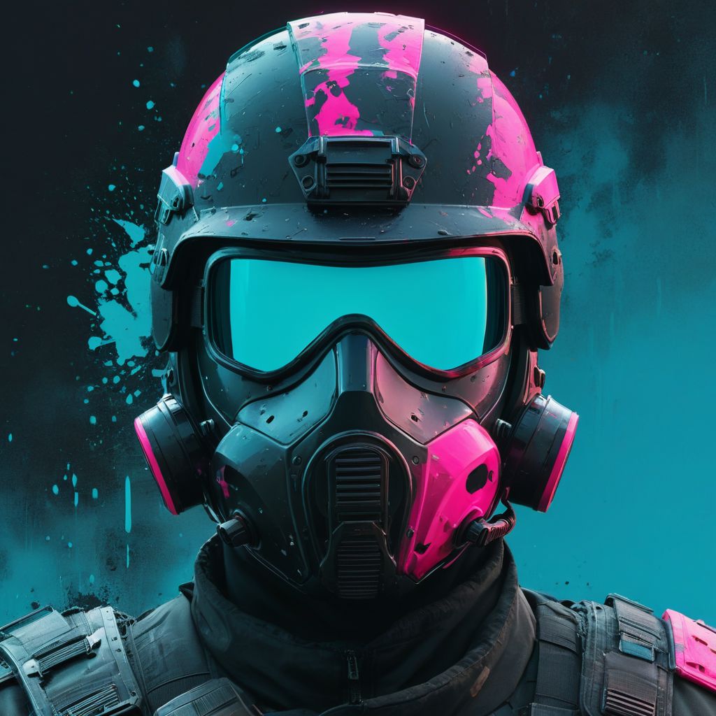 Full dressed in tactical outfit an expert special operation perfect soldier is emerging from the dark black void background, full matte black, subtle glowing hot-pink, hot-cyan hockey mask, looking down towards the viewer. Many details everywhere. Ray-Tracing. Anti-Aliasing. Realistic reflections. Realistic soft shadows. Ironic. Spiritual. Partially introspective. Uplifting. Slightly desaturated colors. Visible paint strokes. Insane quality. Insane resolution. Insane details. Masterpiece. By Simon Stalenhag. 16k resolution, vibrant neon colors with a surrealistic touch, cosmic swirls and streaks, hyper detailed water color digital painting, ink splatter, splash art by Waterhouse, intricate details, Debbie Boom, Marc Allante, Wadim Kashin, reimagined and restyled by Anton Fadeev, deep color, depth of field, maximalism by Minjae Lee, CGSociety, rich contrast, Behance HD, Photoshop after effects<lora:xl_more_art-full_v1:0.3>