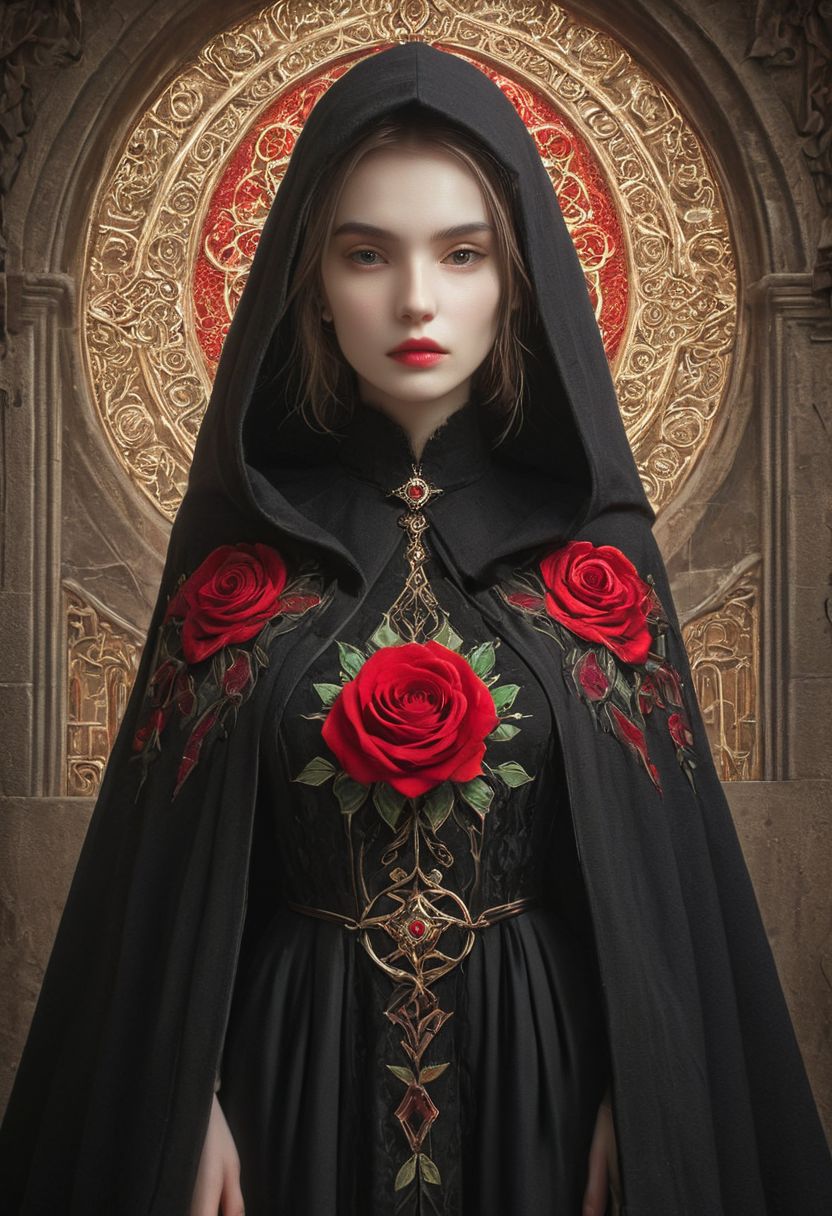 abstract style renaissance elegance: gothic architecture, ornate robes with intricate embroidery, red rose emblem on cloak. . non representational, colors and shapes, expression of feelings, imaginative, highly detailed