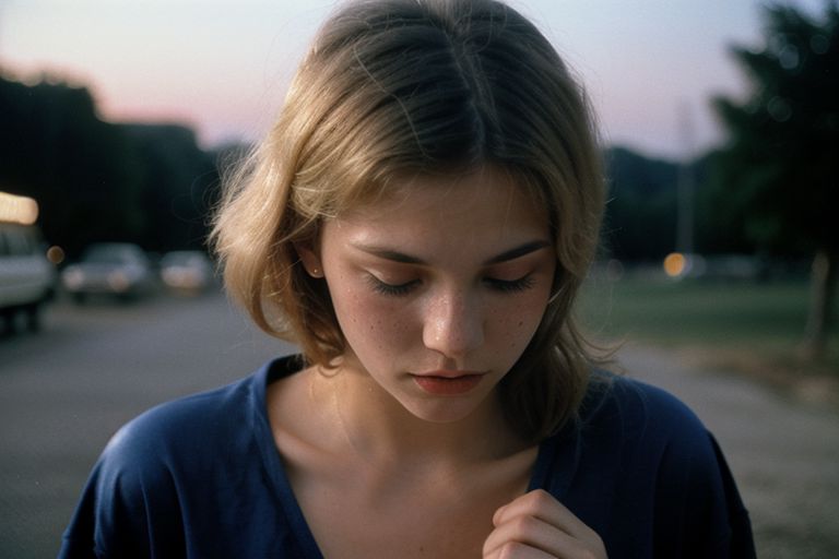 sharp, detailed, film still, A 18yo (blonde) girl with light freckles, thinking of you as her lover, looking down, aroused, shy, film grain, dimly lit, dark lighting, midnight, night time, dark, blue color tone, style by 1980s, no monitor, ambient blue light, (panchromatic), (NIKON FA), ((1988)), (1980s colors), (1980s styles), retro, nostalgic,