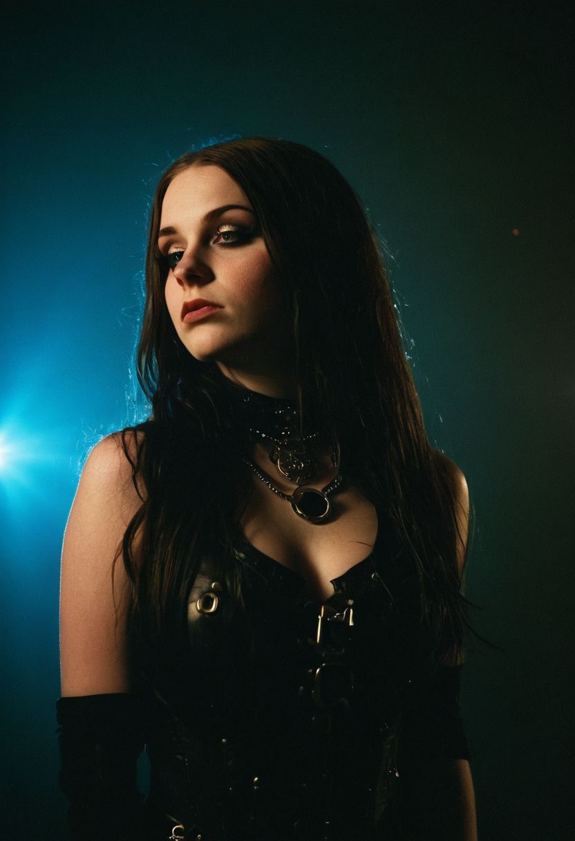 raw photo of 1 goth steampunk girl, 20years old, chubby, ((long hair)),(beautiful face,exquisite face,skin texture:1.2), full body portrait from below, (ultra-wide angle:1.3), head tilted back, profile shot from above, pale skin, (masterpiece,best quality,ultra high res:1.2),(photo-realistic:1.3), silhouette lighting against bright lights , rim lighting, back lit, low key lighting , colored disco lights, kodak gold 200 film, grainy, faded