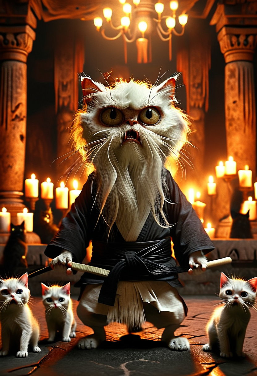 blurred background, realistic, stuning effects, detailed, cinematic, funny face freaky angry old cat with (enormous eyes:1.5) , white long beard, wearing only a black belt, showing karate moves to kittens, group of kittens in the front, in an ancient dark temple, candles, global illumination, the violence is the solution <lora:MJ52:0.6> <lora:add-detail-xl:1> <lora:zkeleton:1>