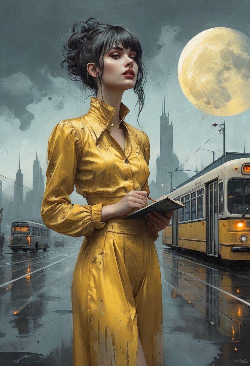old book style ink illustration, on parchment, ink splashes, ink stains, ink smears, faded ink, a painting of a young woman in oversized satin yellow outfit, pale skin, big breasts, slim body, very short hair, messy hair, pixie hairstyle, straight hair, cyan hair, grey eyes, deep background, a digital painting, by Justin Gerard, tumblr, dan mumford tom bagshaw, 64x64, on street, writing on a wall with a spray, cute detailed digital art, painting of beautiful, very stylized, hildebrandt, beautiful deep colours, bus station, glass, fog, moon, in the clouds, skyscrapers, futuristic transport, fractals, night, gloomy tones,mentixis, linquivera