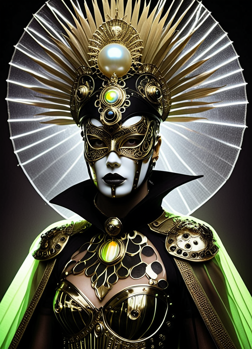 hyperrealistic art breathtaking helios,psy,DARK Sci-fi rococo Style - Adorned in a mask and cape reminiscent of D'Artagnan's era, a skilled cyborg knightess resembling the girl with the pearl earrings, weathered gold and wooden armor sun-bleached, her eyes gleaming with triumph. holding a radiant translucent glowing surreal beige orbstaff, adorned with a towering neon translucente sss sedge hat veiling her face, her metallic intricacies faintly aglow in translucent dark bleaked neon, creating a hyperpunk scene with desaturated dark rgb spectral neon and translucent black details, colorful (polaroid:0.7) with vibrant colors, (vacations, high resolution:1.3), (small, selective focus, european film:1.2), (sexual advance:1.1), closeup <lora:helios2:1> . award-winning, professional, highly detailed . extremely high-resolution details, photographic, realism pushed to extreme, fine texture, incredibly lifelike, Cinematic photography, movie mood, cinematic light, compelling composition, storytelling elements, conveys emotion, mood, and narrative depth, creating visually striking images that feel like still frames from a film