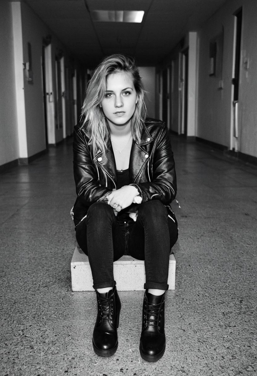 german street style girl, 25 years old,((detailed face, detailed eyes)), ((open jacket)), ankle boots, hot pants, abandoned hospital at nigth, sitting, wide angle, rim lighting, edge lighting, ilford 3200 b&w analog film on 14mm lens, faded, pixelated, grainy, blurry