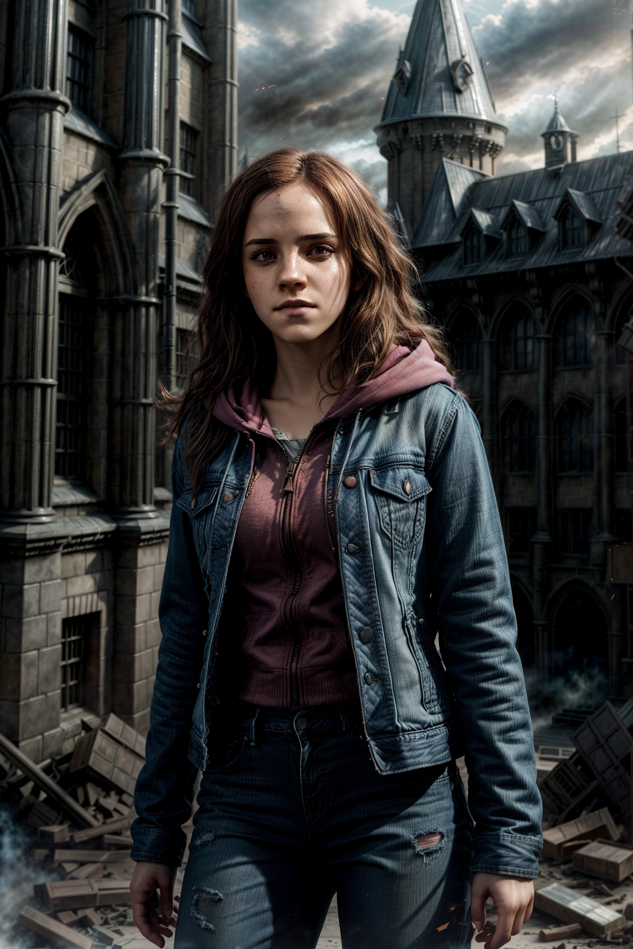 Hermione_Granger, a woman in a a blue jeans jacket and pink zip hoodie and jeans pant, long brown hair, a witch, long flowing hair, in front of a building with a glass, in front of grey sepia smoke background with a sky full of cloud background and some rock in the air, outside, (in front of Hogwarts half-destroyed:1.2), poster style, close-up portrait, dark tones, chiaroscuro, detailed, hdr, epic background, line art, digital illustration, comic style, dynamic, highly detailed, artstation, concept art, smooth, sharp focus, illustration, Thomas Moran style, art by Carne Griffiths and Wadim Kashin, detailed background, 60-30-10 color rule, warm tones, godrays, unreal engine, greg rutkowski, loish, rhads, beeple, makoto shinkai and lois van baarle, ilya kuvshinov, rossdraws, tom bagshaw, alphonse mucha, global illumination, detailed and intricate environment <lora:Hermione Granger:0.6> <lora:more_details:1> <lyco:GoodHands-beta2:1.0>