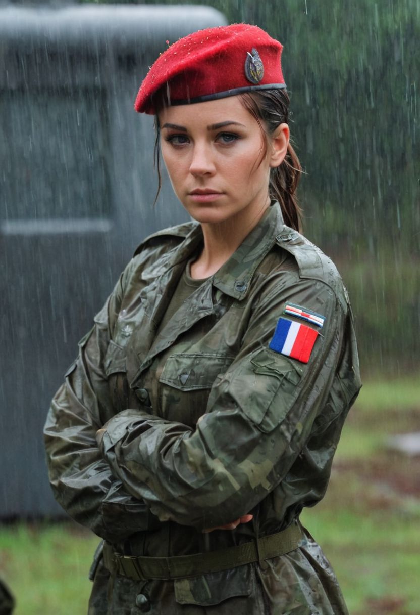 French, french badge, female soldier, brunette, ponytail, camo military fatigues, red military beret, outdoors, barracks, tired gaze, rain, wet clothes