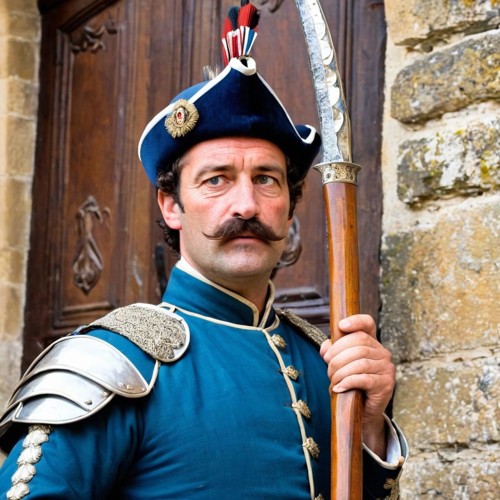 score_9, score_8_up, score_7_up, 1man, man 30 years old, (holds a pike in his hand), middle age, (pikeman), middle age, mustache, wrinkles on his face, serious, soldier uniform with predominance of blue color, in front of the doors of a medieval castle, torches