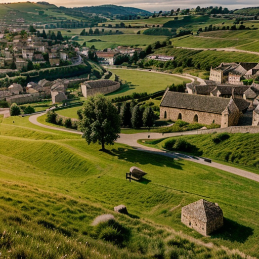 (photo realistic:1.5), (RAW photo, soft lighting, masterpiece:1.2), (high quality, best quality, ultra detailed, highly detailed), (medieval town on a grassy hill:1.2), (green dragon in the background)