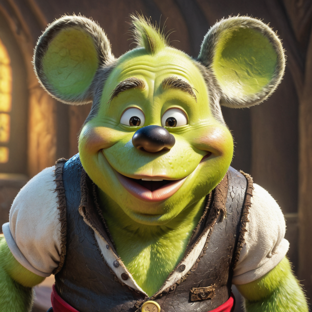 (caricature:1.1) of hybrid shrek sexy (mickey mouse:1.4) with exaggerated features pale white skin, realistic textures, humor-infused, playful pixar style, masterpeice dof, best quality, every detail <lora:Contained_Color_SDXL:1> Contained Color