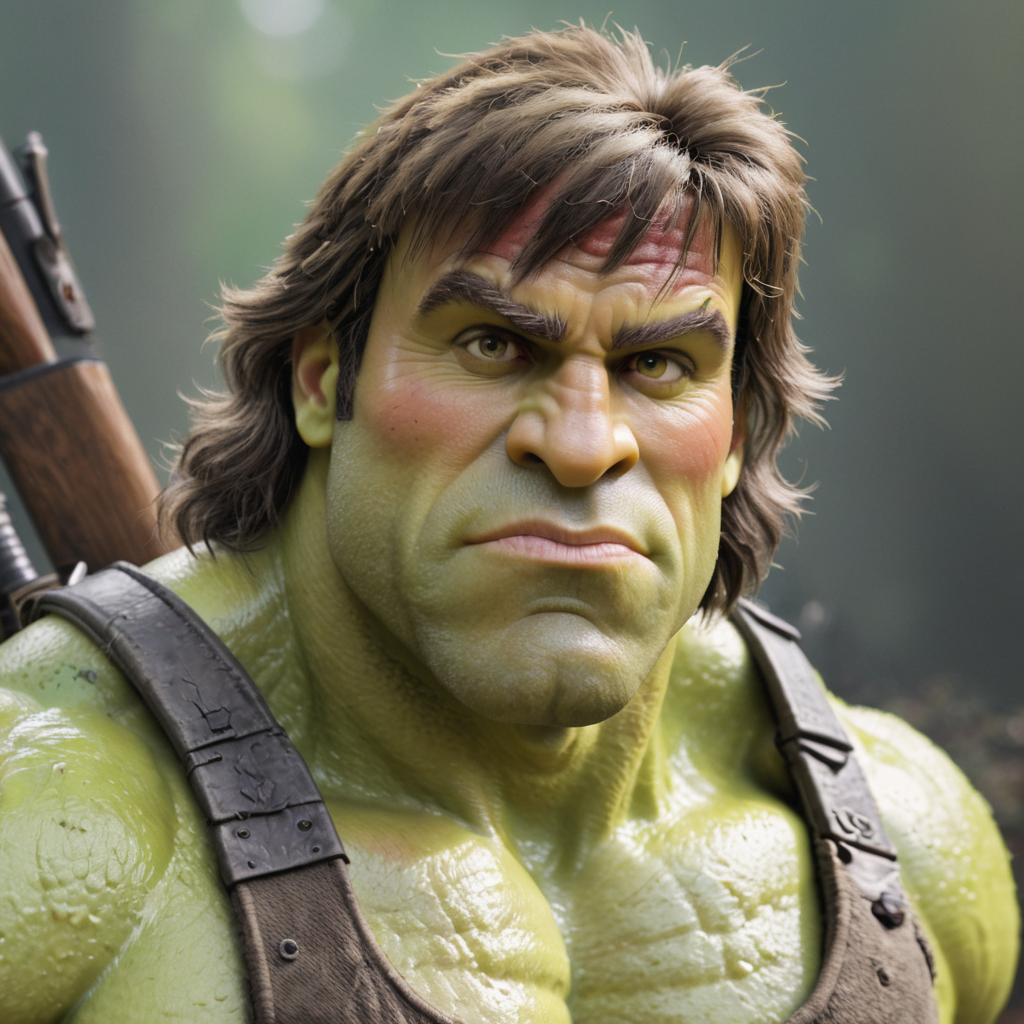 (caricature:1.1) of hybrid shrek sexy (rambo:2.3) with exaggerated features pale white skin, realistic textures, humor-infused, playful pixar style, masterpeice dof, best quality, every detail <lora:Contained_Color_SDXL:1> Contained Color