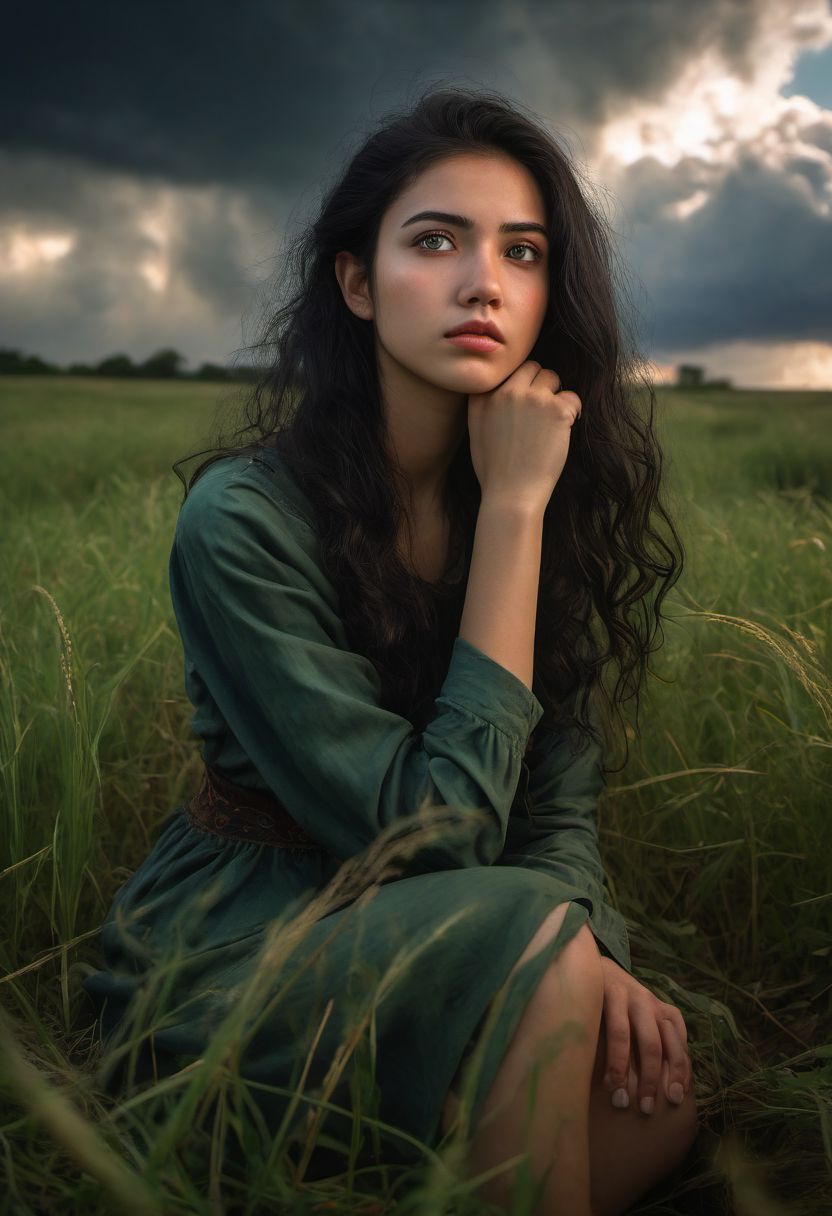 dutch angle, over the shoulder portrait of a Spanish girl, sitting in a field of dark dreams, black hair, alluring, secretive, storm clouds, whimsical charm, ethereal glow, sharp focus on Green eyes, in the style of realism, emotional and dramatic scenes, Style of Kriengin, Brandon Wolfel, sharp focus, style of Jay Anacleto, Esao Andrews, photorealism, extremely detailed ultrasharp, masterpiece,best quality, ultradetailed, intricated details, extremally detailed background, ultra realistic, 32k,RAW photo, 8k uhd, dslr, bokeh, depth of field, soft lighting, high quality, film grain, beautiful and aesthetic, extremely detailed, natural shadows,, (2\3 rule composition:0.5),, volumetric lighting, eye contact with viewer, easynegative, negative_hand