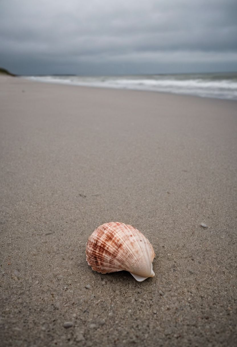 An empty beach stretches out under a heavy, overcast sky, with just a lone seashell resting on the wet sand near the water's edge. The scene captured by the Sony A7IV with a 20mm G Master lens set at a wide aperture of F1.5 unfolds with haunting beauty, enveloped in a moody and melancholic atmosphere, featuring the contrasting tones of soft pink and charcoal gray.