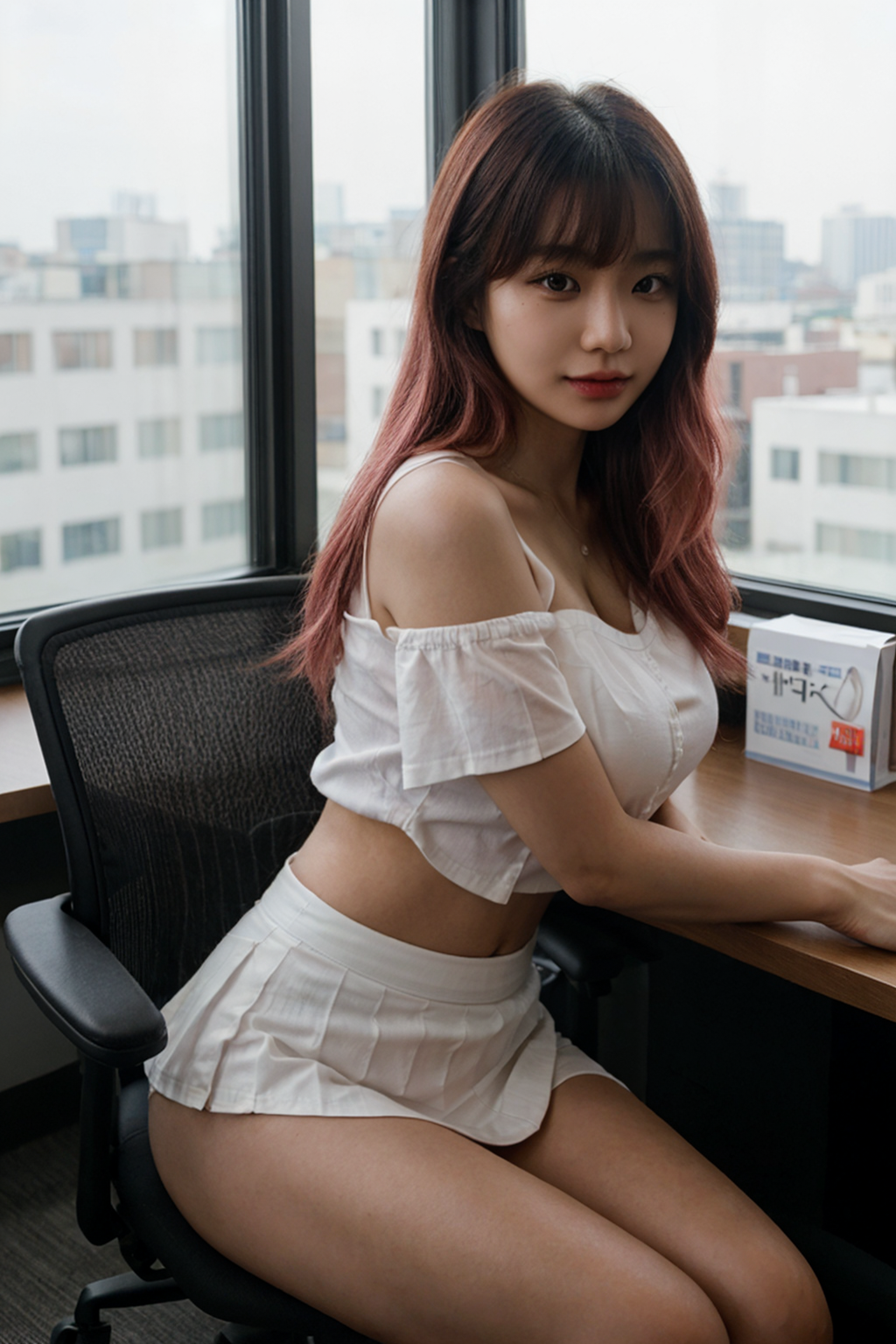 Korean, woman, (shot taken from high above woman), front view, looking at viewer, super cute woman, (long pink hair), short bangs, (white shirt), bare shoulders, one arm on desk, one arm on leg, mini skirt, (black skirt:1.2), slim, hanging breasts, large breasts, pretty, brown eyes, sat in office chair, woman is facing sideways from desk, office chair has back, modern office, window, white and black themed office, spotlight, dramatic shadows, warm tones, soft focus, atmospheric lens, SkinHairDetail, OverallDetail, epiCPhoto, <lora:Background_Detail_v3:0.6> <lora:more_details:0.5> <lora:bgm-beta1a:0.1> <lora:breastsizeslideroffset:0.13> <lora:AloeVera_Thiccness_Slider:-0.5> <lora:koreanDollLikeness:1>