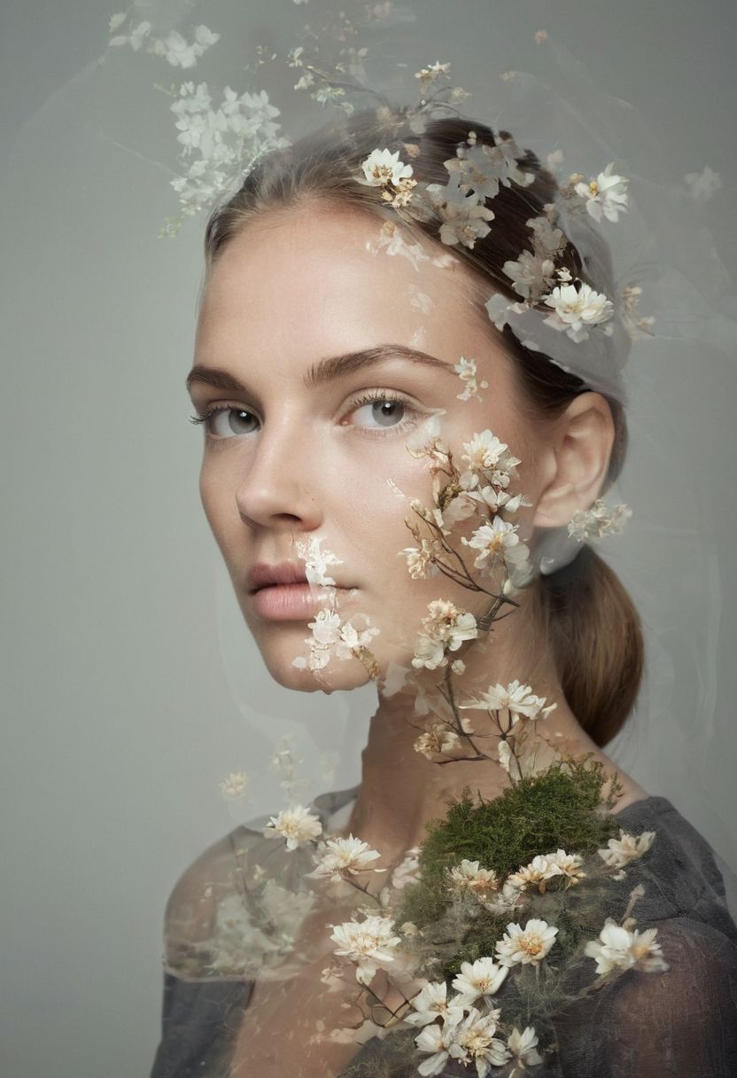 Capture a captivating double exposure portrait of an individual in a studio environment. Position the model against a clean, minimalist backdrop, ensuring they are illuminated with gentle, diffused lighting that accentuates their facial features. Seamlessly blend a secondary image within the contours of the subject, incorporating elements of nature like trees, flowers, or abstract designs to enhance depth and intrigue. Strive for a seamless integration between the exposures, meticulously balancing details and contrast to evoke a surreal, artistic mood. This photograph was taken with a Canon EOS R5 paired with an RF 85mm f/1.2L lens and subsequently refined in Adobe Photoshop to perfect the double exposure effect and ensure a harmonious composition.