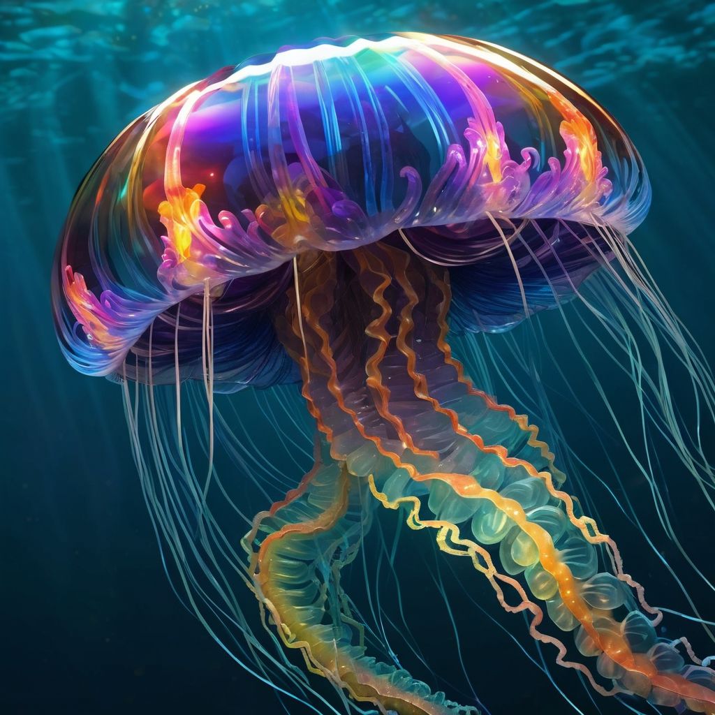 A captivating 3D render of a fantastical jellyfish-inspired creature, meticulously crafted from multi-colored glass. The vibrant rainbow hues of the glass shimmer and reflect light, creating a mesmerizing display. The delicate, translucent creature hovers gracefully in an underwater world teeming with lush coral and a kaleidoscope of tropical fish.a mysterious and alluring phoenix woman. The silhouette of the phoenix woman is intricately crafted through a series of vivid interconnected aquatic life, creating an illusion of depth and dimension. features a striking contrast of dark and light shades, accentuating her captivating profile. The cinematic quality of the image adds depth and a sense of motion, making it appear as though the jellyfish is effortlessly floating through the waves in a harmonious dance with its aquatic surroundings., vibrant, photo, 3d render, cinematic