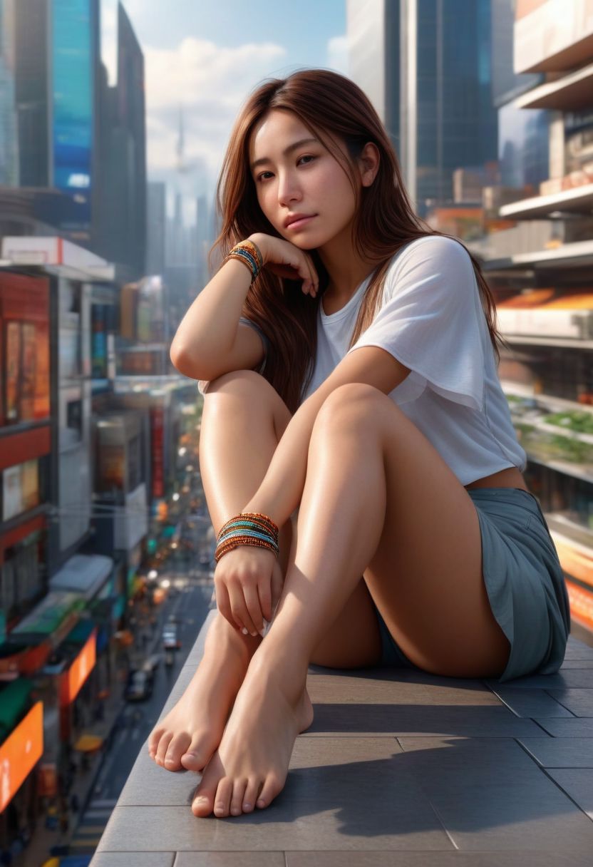 1girl, solo, long hair, brown hair, brown eyes, sitting, barefoot, bracelet, feet, legs, arm support, building, city, realistic, cityscape, photo background, (((masterpiece))), ((photorealistic:1.4)), ((realistic:1.4)), ((best quality)), ((official art, extremely detailed CG unity 8k wallpaper)), ((highly detailed)), ((absurdres)), ((8k resolution)),