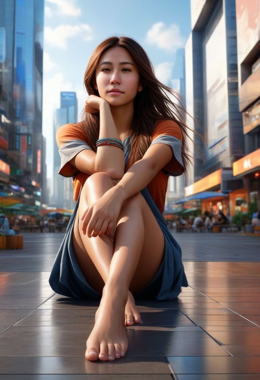 1girl, solo, long hair, brown hair, brown eyes, sitting, barefoot, bracelet, feet, legs, arm support, building, city, realistic, cityscape, photo background, (((masterpiece))), ((photorealistic:1.4)), ((realistic:1.4)), ((best quality)), ((official art, extremely detailed CG unity 8k wallpaper)), ((highly detailed)), ((absurdres)), ((8k resolution)),