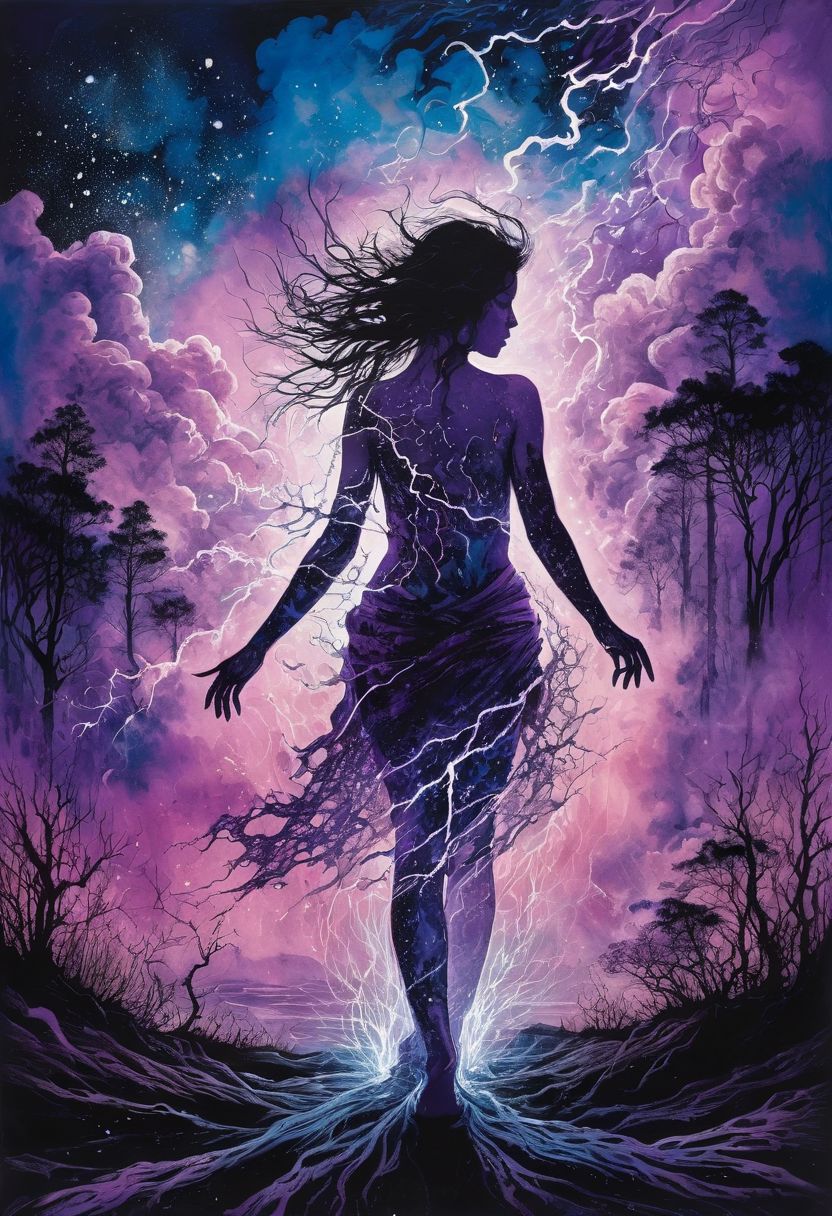 Realistic crazy storm sorceress, lightening elemental, cracked earth, crater, silhouette style, thunder clouds, lightening, essence of water, at Dawn, forest, smoke, Bauhaus Art, (monochromatic art by Junji Ito, Carne Griffiths, High contrast, minimalistic), purple, dark blue and pink), dramatic, (silhouette weaved from splashes of clouds and lightening), (clothed in purple, encased in light), nudity, intricate details, (zentangle tattoo), scar, (((fractal art), (((abstract art))), (((psychedelic art))))),