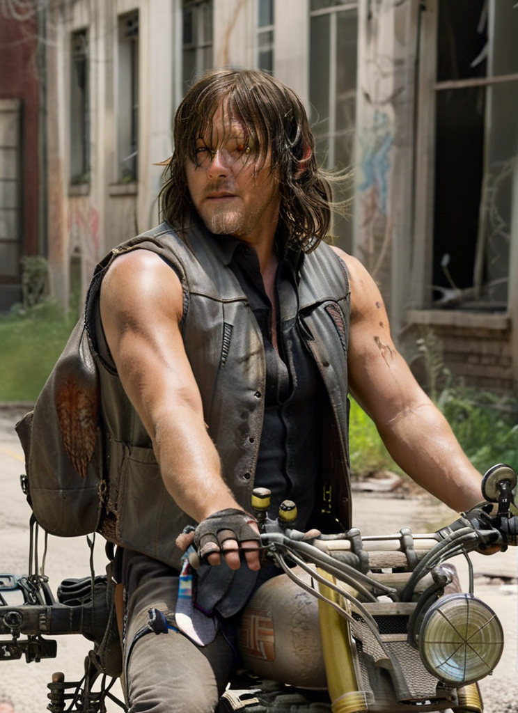 cinematic movie still of TWDDaryl, riding TWDDDBike, weathered vest with faded dirty wings painted on back, looking over shoulder, scruffy beard, dirty hair, abandoned buildings, dirty street, hyperdetailed, shallow depth of field, f1.4, <lora:TWDDaryl:0.7> <lora:TWDDDBike:0.7>