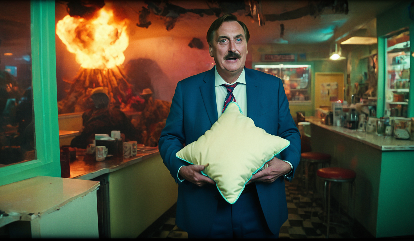 ,,( Carrying a pillow:1.6), ,Film scene showcasing MikeLindell person , escaping from an alien prison using improvised gadgets, with dim ambient lights from alien tech, taken in tight close-ups, highlighting ingenuity under pressure., (Wearing a cowboy hat with a suit:1.49), Mind control chip, panic, Caps Lock explosions,( explosion artstyle:3), Movie moment with MikeLindell Person, mistakenly entering a funhouse and being spooked by his exaggerated reflections, shot under colorful lighting, highlighting comedic self-confrontation., Movie moment with MikeLindell person , in a 90s diner with checkered floors, under neon and ambient lighting, captured in a Dutch tilt, emphasizing the decade's quirky charm.<lora:MyPillow Mike Lindell SDXL - Trigger is Mikelindell Person:1> <lora:Blow It Up - (Trigger words are Explosion Artstyle) :2>