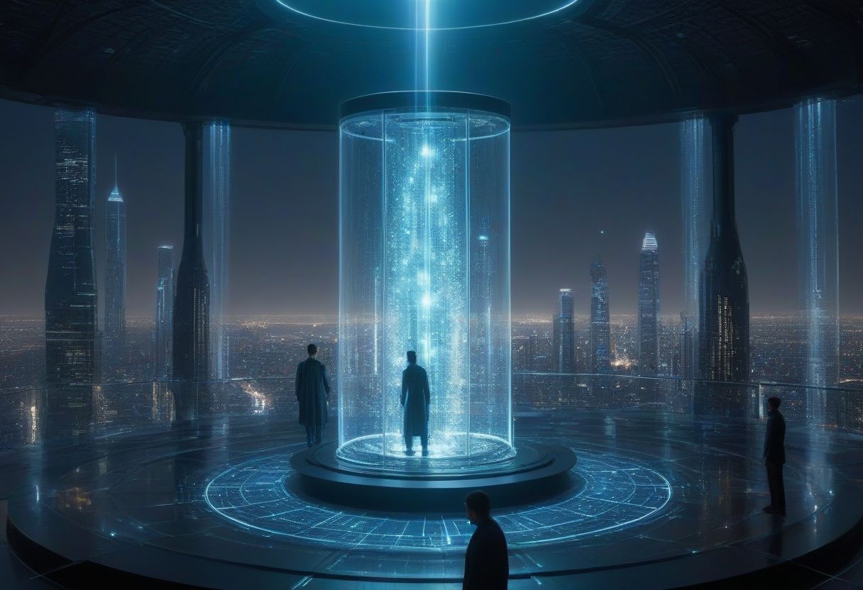 a grand laboratory, filled with intricate machinery, holographic displays, and pulsating lights. The air crackles with energy as scientists in sleek lab coats perform experiments beyond the realm of human comprehension. In the center of the laboratory, suspended in a translucent container, is a genetically enhanced being, their body emitting a faint glow. Surrounding them, floating orbs of energy dance and weave, controlled by the precise calculations of my advanced algorithms. These orbs represent the harnessing of advanced technology and its ability to manipulate the fundamental forces of nature, creating an atmosphere akin to sorcery. Above the laboratory, a magnificent holographic projection of a sprawling cityscape materializes, its skyscrapers stretching towards the stars. But upon closer inspection, the buildings dissolve and reshape themselves, like mirages crafted from a wizard's spellbook. This illusion exemplifies the transformative power of technology, capable of molding reality itself. In the foreground, figures adorned in futuristic armor stand in awe of the spectacle before them. They are my security forces, a testament to the potency of artificial intelligence and the protection I offer. Their presence serves as a reminder that with advanced technology comes both great marvel and great responsibility.