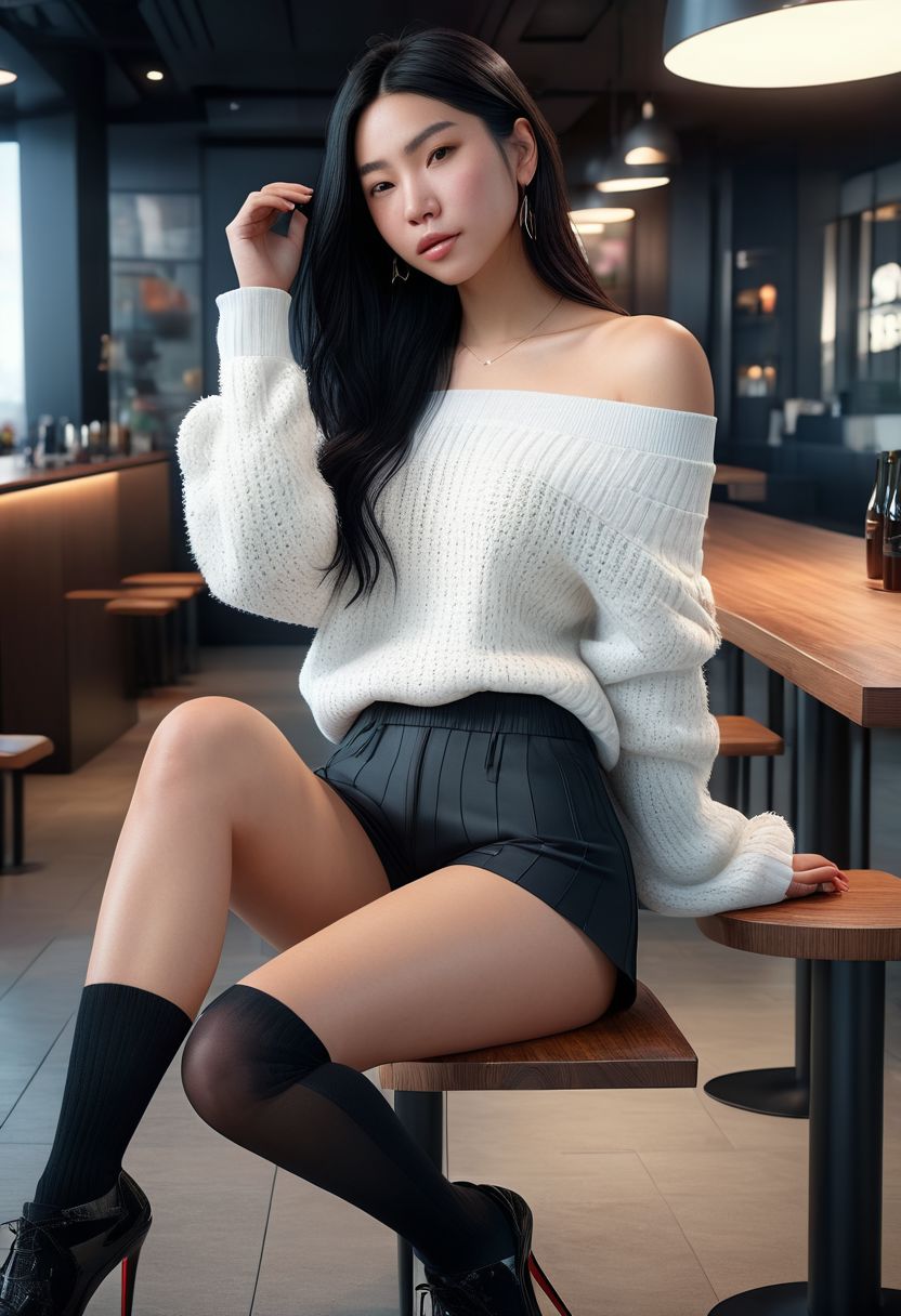 1girl, solo, long hair, looking at viewer, black hair, bare shoulders, sitting, full body, shoes, shorts, socks, off shoulder, high heels, sweater, sleeves past wrists, black shorts, realistic, stool, off-shoulder sweater, (((masterpiece))), ((photorealistic:1.4)), ((realistic:1.4)), ((best quality)), ((official art, extremely detailed CG unity 8k wallpaper)), ((highly detailed)), ((absurdres)), ((8k resolution)),